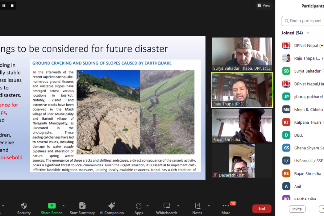 In a virtual event held on 19th February 2024 in support of UN FAO, the DPNet shared the aftermath and recovery efforts following the devastating Jajarkot earthquake. This online gathering, chaired by DPNet Chair, Surya Bahadur Thapa, and with the contextual stage set by Vice Chair Dr. Raju Thapa, drew participation from 64 attendees, highlighting the urgency and importance of post disaster review in the wake of recent Jajarkot earthquake.